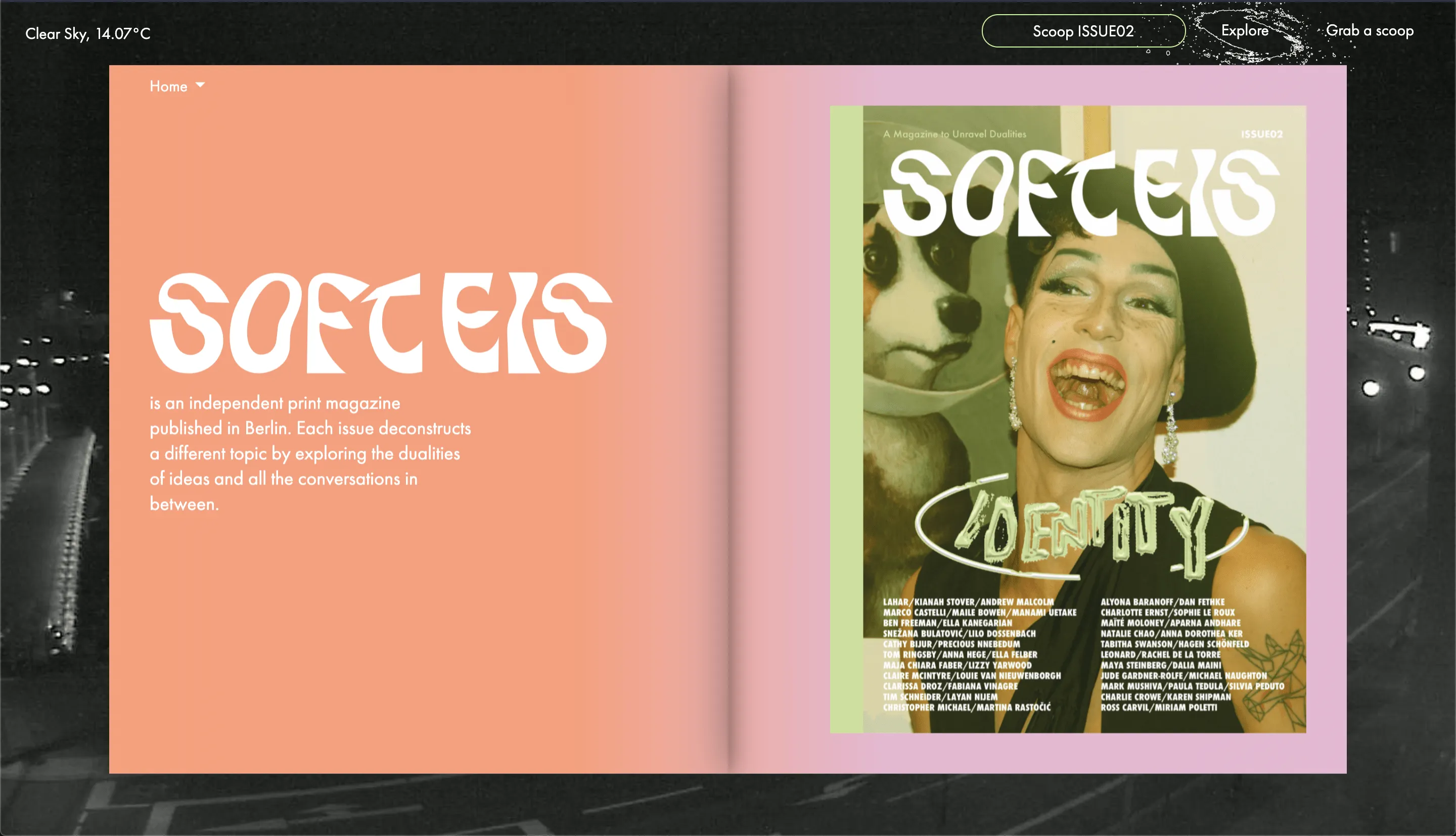 Web development and design for SOFT EIS, an independent print magazine published in Berlin. Each issue deconstructs a different topic by exploring the dualities of ideas and all the conversations in between.
